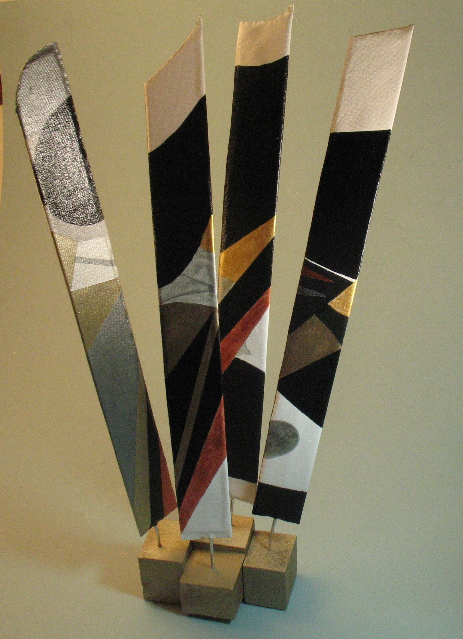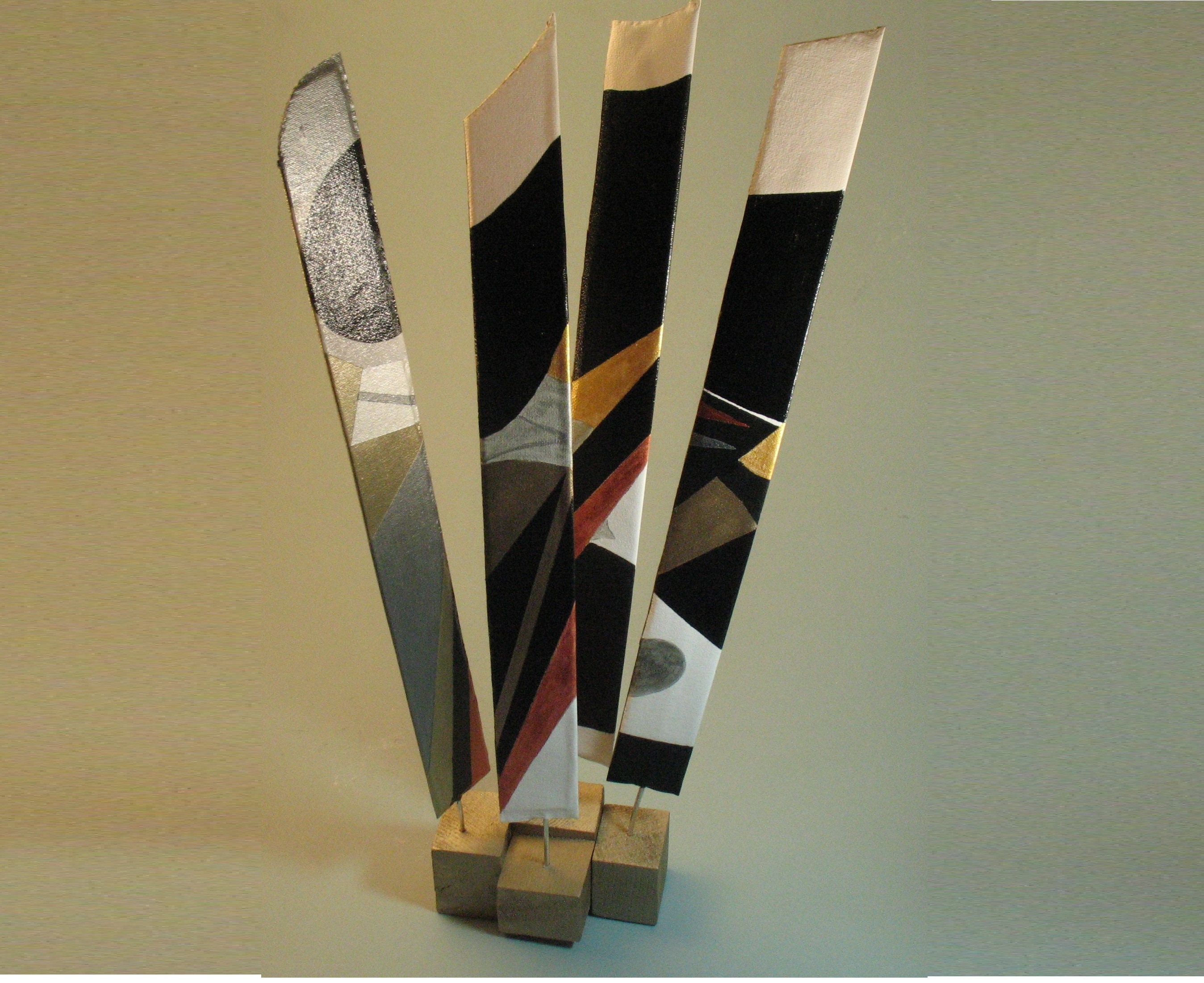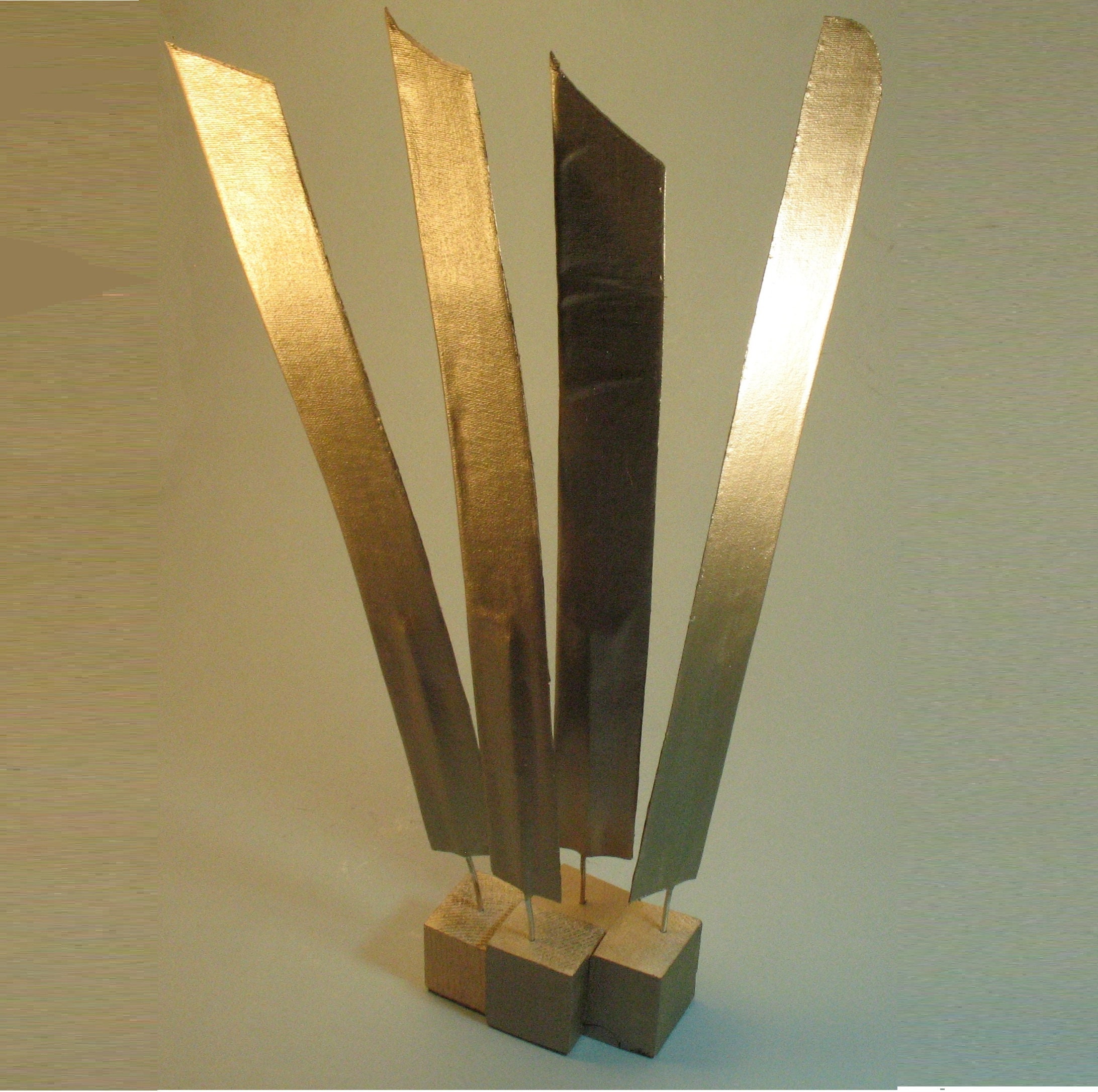 This sculpture represents a unique one-of-a-kind sculptural painting on canvas. The vanes are bendable, but for this design we decided it needed no curls or furls. From the rear, it has the look of a prototype replica for a monumental piece of architectural art.